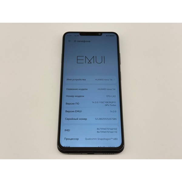 Huawei nova 14i 8GB/128GB (STG-LX2), цвет черный, Экран 6.95" технология IPS 376 ppi частота обновления экрана 90 Гц, 8-и ядерный процессор Qualcomm Snapdragon 680 (2 400 МГц), двойная камера 50 Мп + 2 Мп, Фронтальная 8 Мп, HarmonyOS 2.0, память 8Гб/128Гб, Сканер отпечатка пальца и лица, Быстрая зарядка SuperCharge (40 Вт), АКБ Емкость 7000 мА·ч, Международная версия, NFC, LTE.