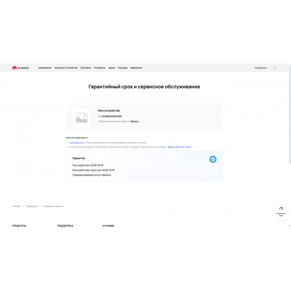 - Официальная гарантия сервисного центра Huawei до 18 декабря 2026 года.