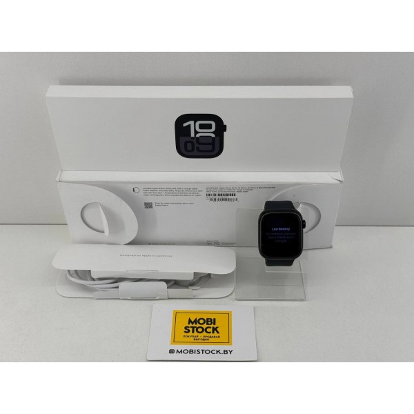 Apple Watch Series 10 42 мм (MWWE3), Model A2997, (алюминиевый корпус, черный/черный, спортивный силиконовый ремешок S/M), синхронизация с iOS, экран OLED, поддержка SIM-карты: нет, пульсометр, измерение кислорода в крови, ЭКГ, AOD, GPS, Bluetooth 5.3, корпус: металл (алюминий), ремешок: силикон.